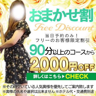 *キャンセル不可*交通費別途(エリアによって変動)1,000円~*女性によっては別途特別指名料のかかる女性がおります。(HPをご参照ください)*ホテル代別*他のサービスや割引との併用不可*お電話での成約後の申告では適用できませんので予めご了承ください